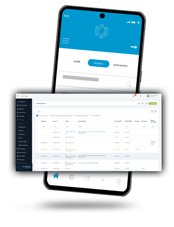 Met Furoo heb je al je bedrijfszaken onder één dak. Van klantenbeheer tot facturatie en van urenregistratie tot kostenbeheersing, alles is eenvoudig te beheren via één overzichtelijk platform.